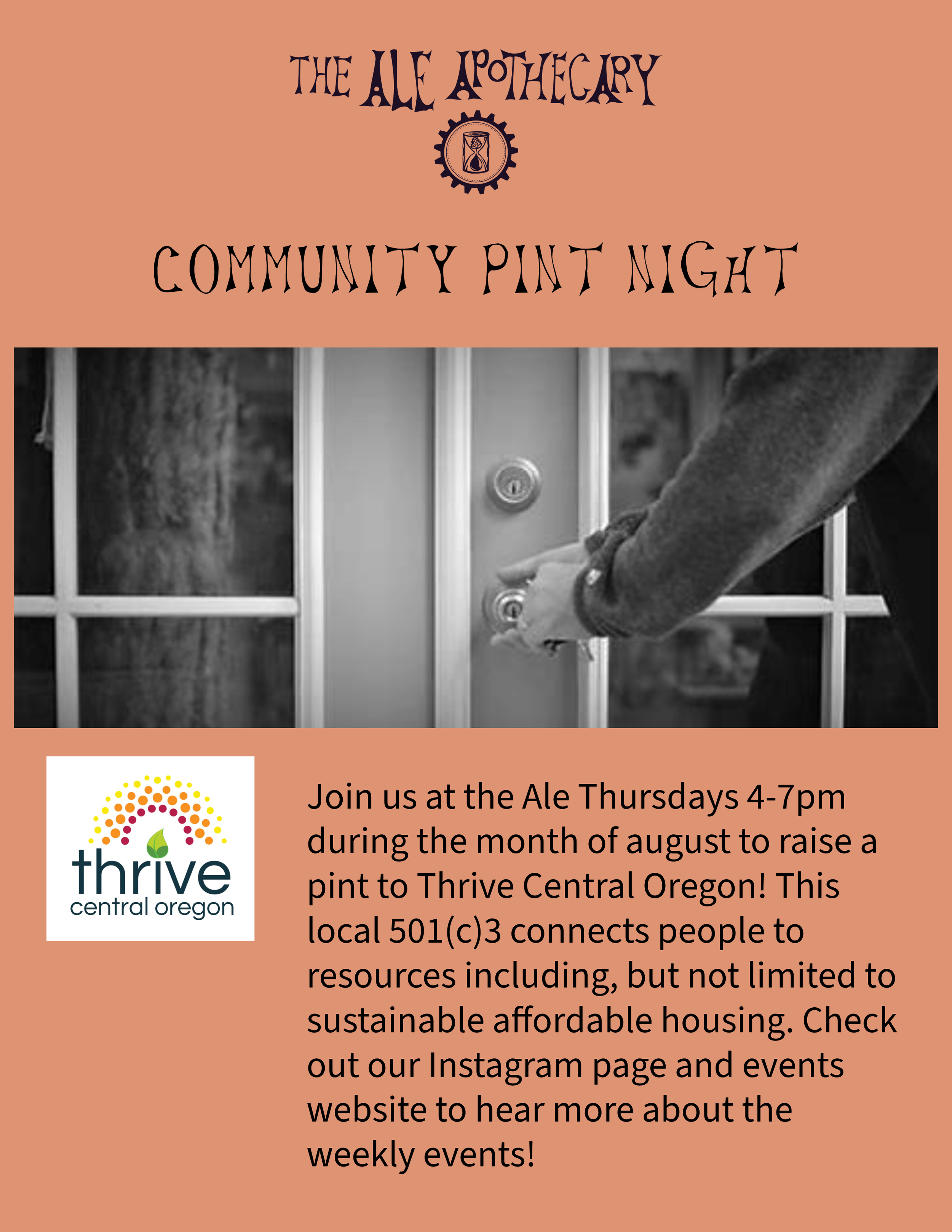 Join us at Ale for a night of good beer and good deeds! We're teaming up this month with Thrive Central Oregon to raise funds that support housing and community stability in Central Oregon. Grab a pint, connect with friends and help build a stronger community.